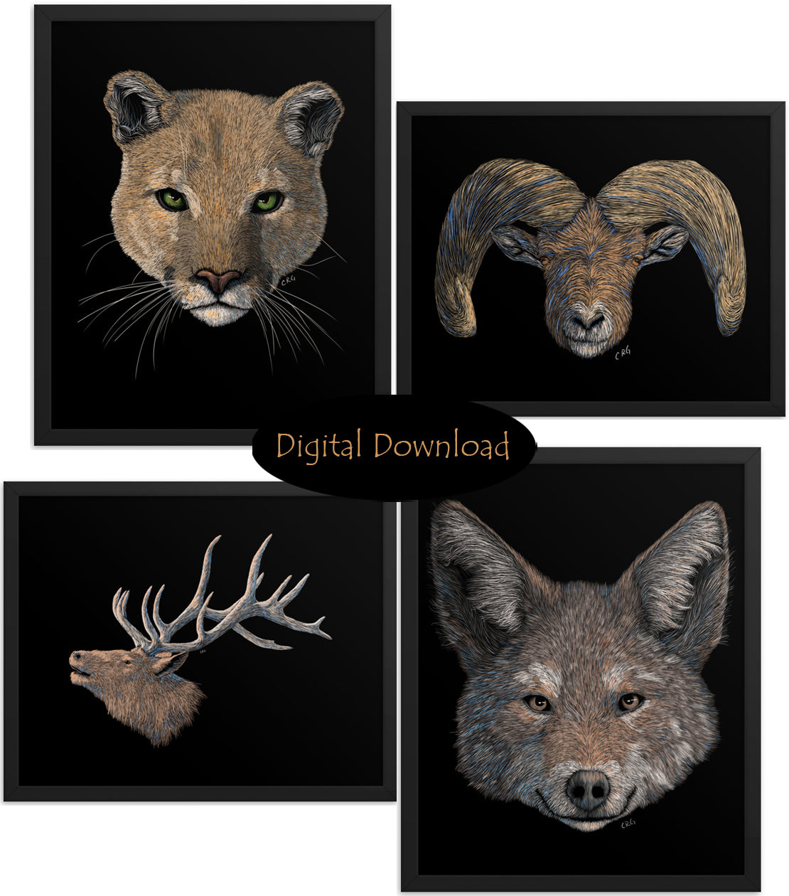 -You'll get 4 unique drawings of some of the beautiful wildlife that can be found in the Grand Canyon--a mountain lion, a bighorn sheep, an elk, and a coyote.