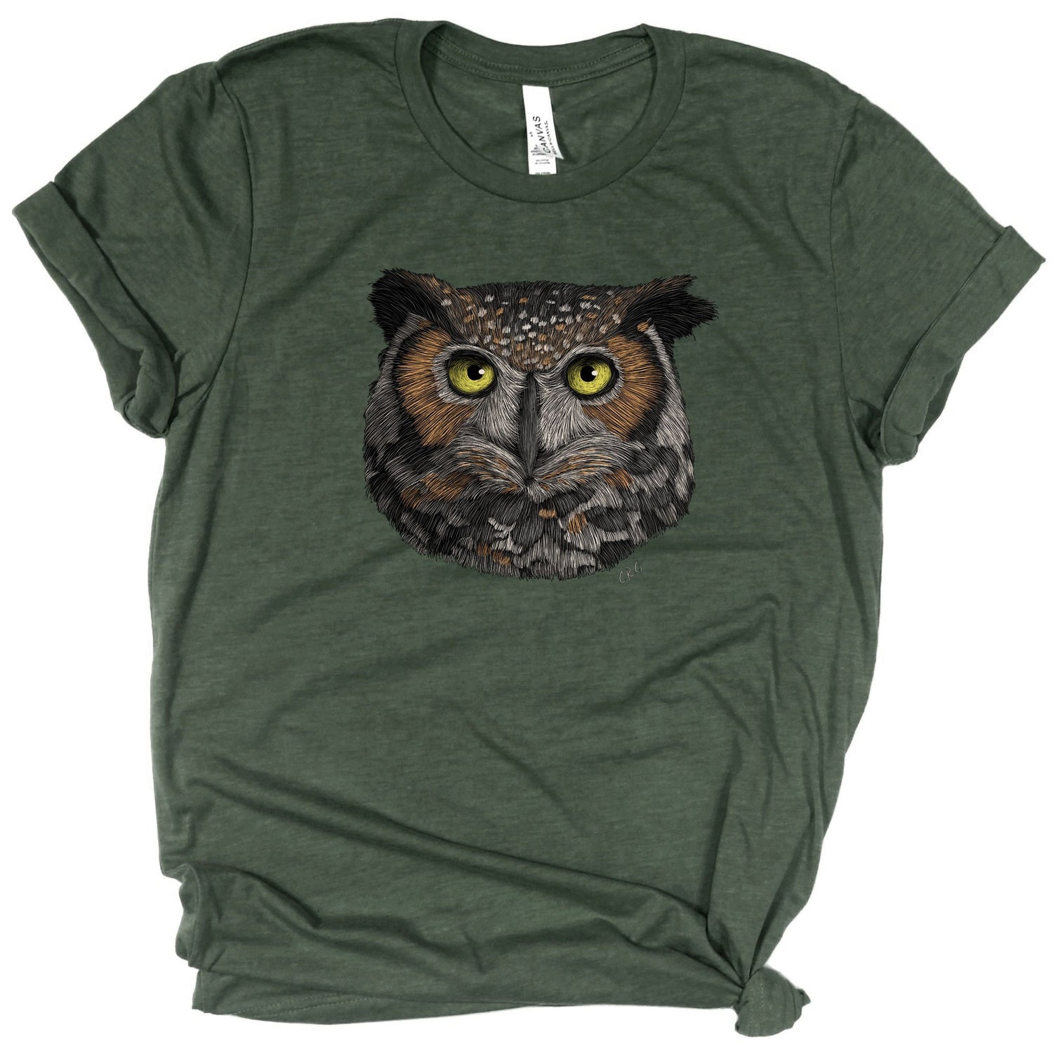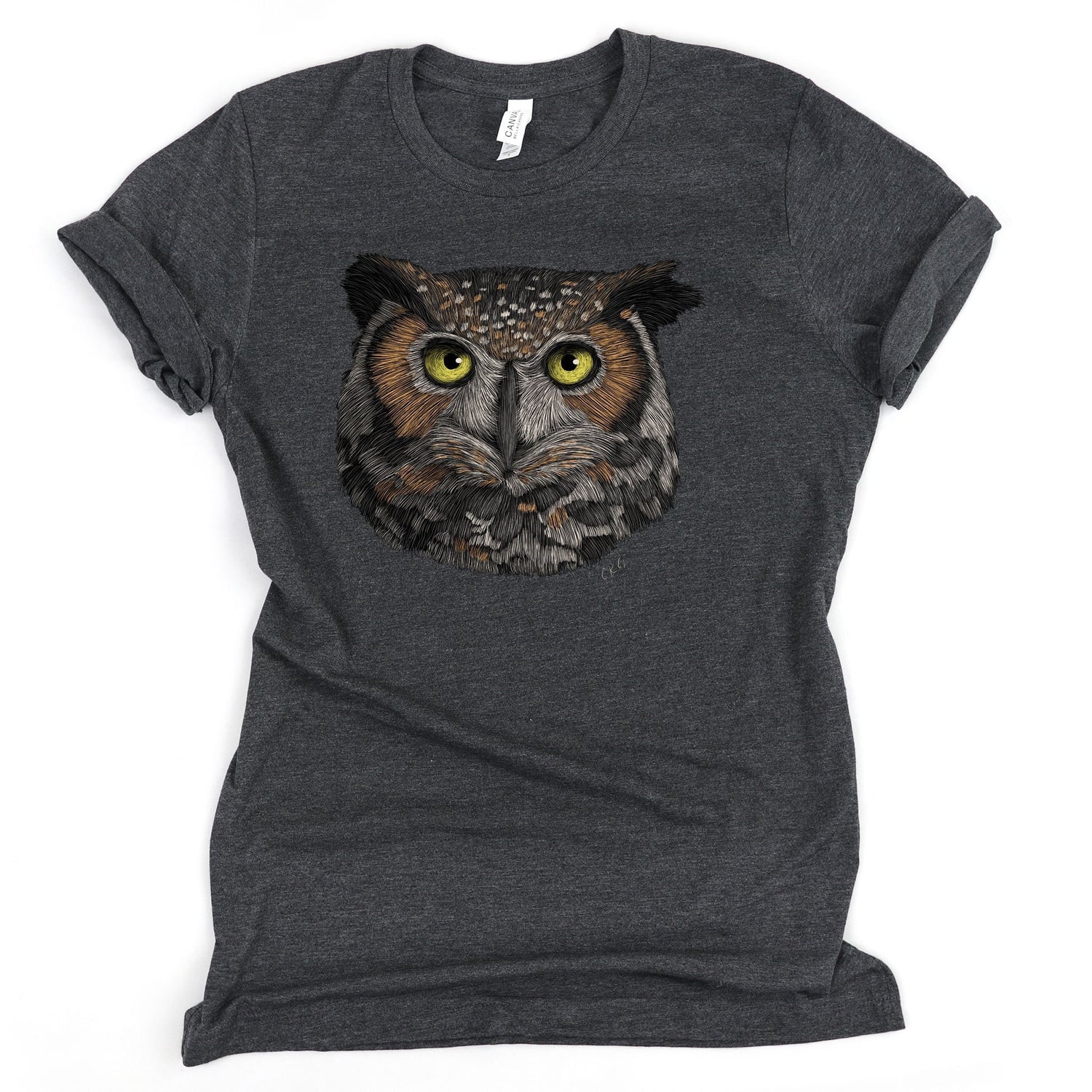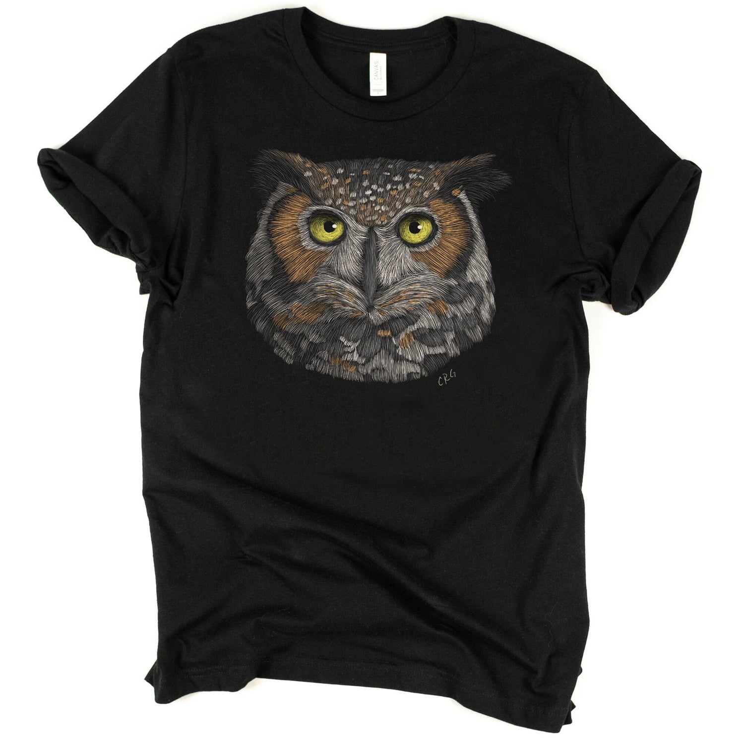 Did you know that when a great horned owl clenches it's talons, it takes a force of 28 pounds to open? Luckily, this shirt has no talons, and needs no force to open! Show your love for these beautiful birds without the worry of it grabbing on to everything.