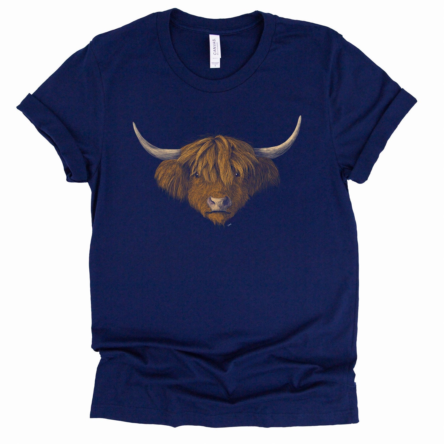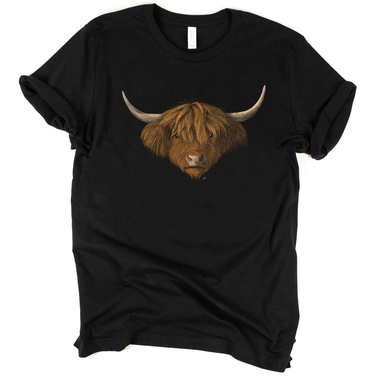 Did you know highland cow's long hair helps keep the rain and snow off so that they can survive the cold Scottish winters? This shirt has no long hair, and might have trouble keeping the rain and snow off, but it is still very soft! Show your love for these cute cows without the worry of finding enough space for it to stay.