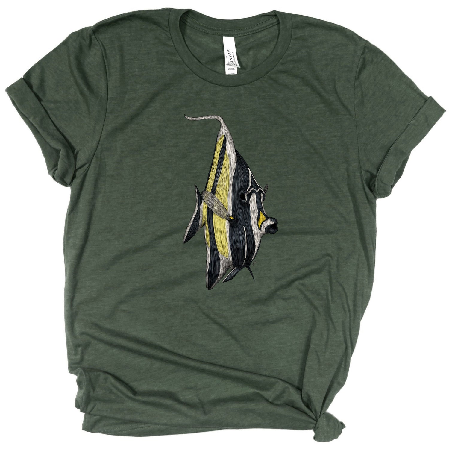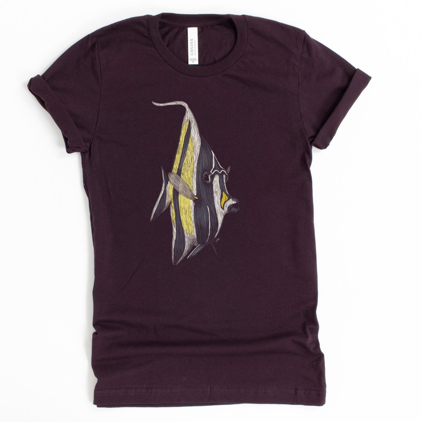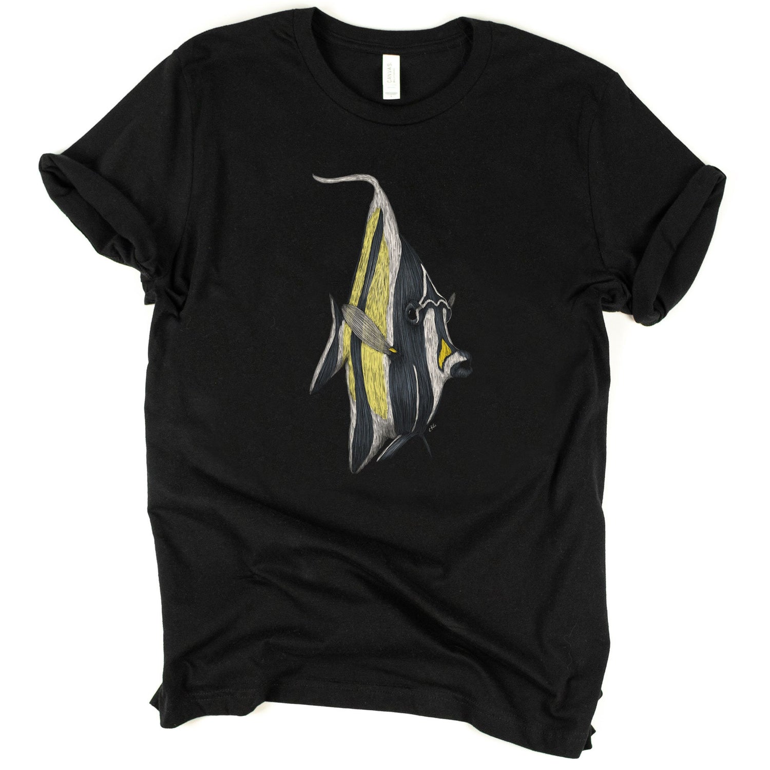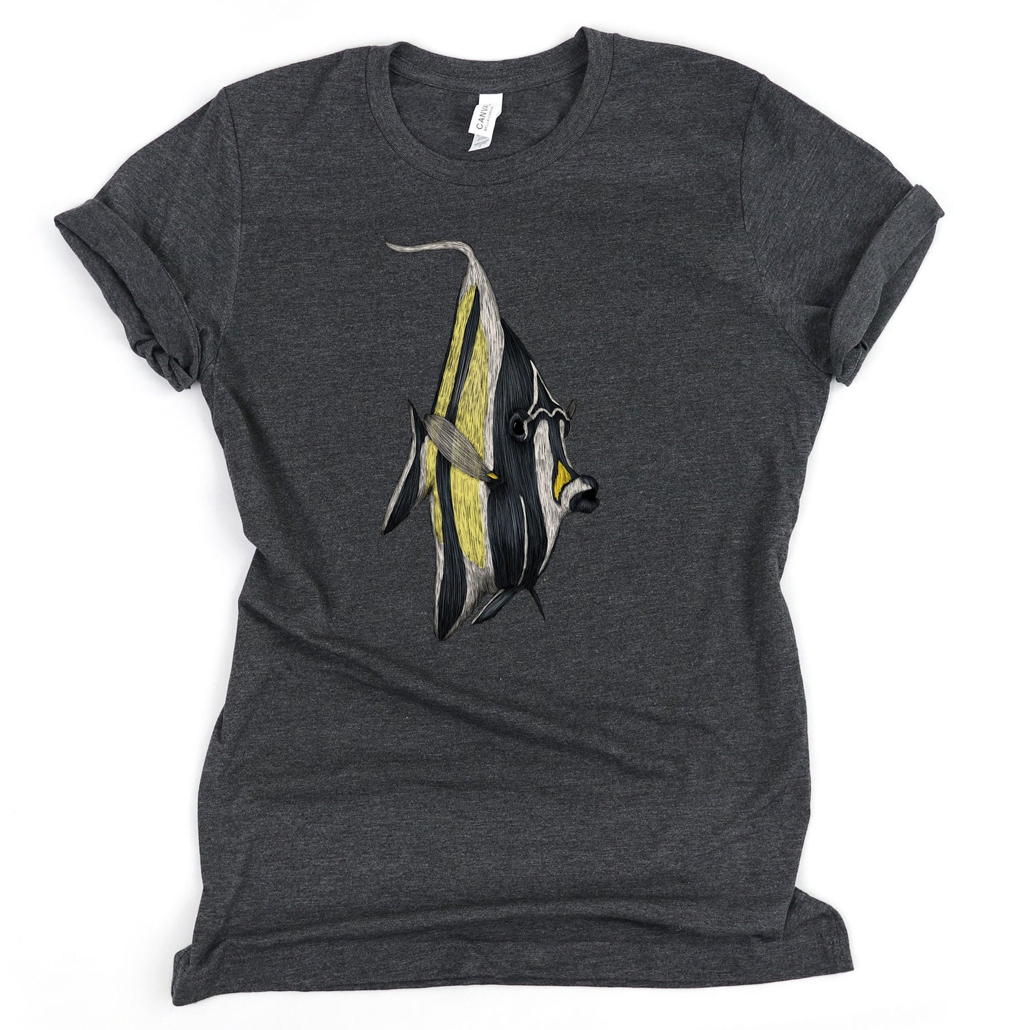 Did you know that even though Moorish idols are a coveted aquarium fish, but they do very poorly in captivity, barely living a year, compared to up to 4 in the wild? They're vulnerable to stress in captivity, and even though they normally get along well with other fish in the wild, in captivity they will be aggressive with other fish thinking their territory is being threatened. This shirt is not as beautiful as these fish, but it is still soft. Show your love for these shy fish without the worry of stressing them out.
