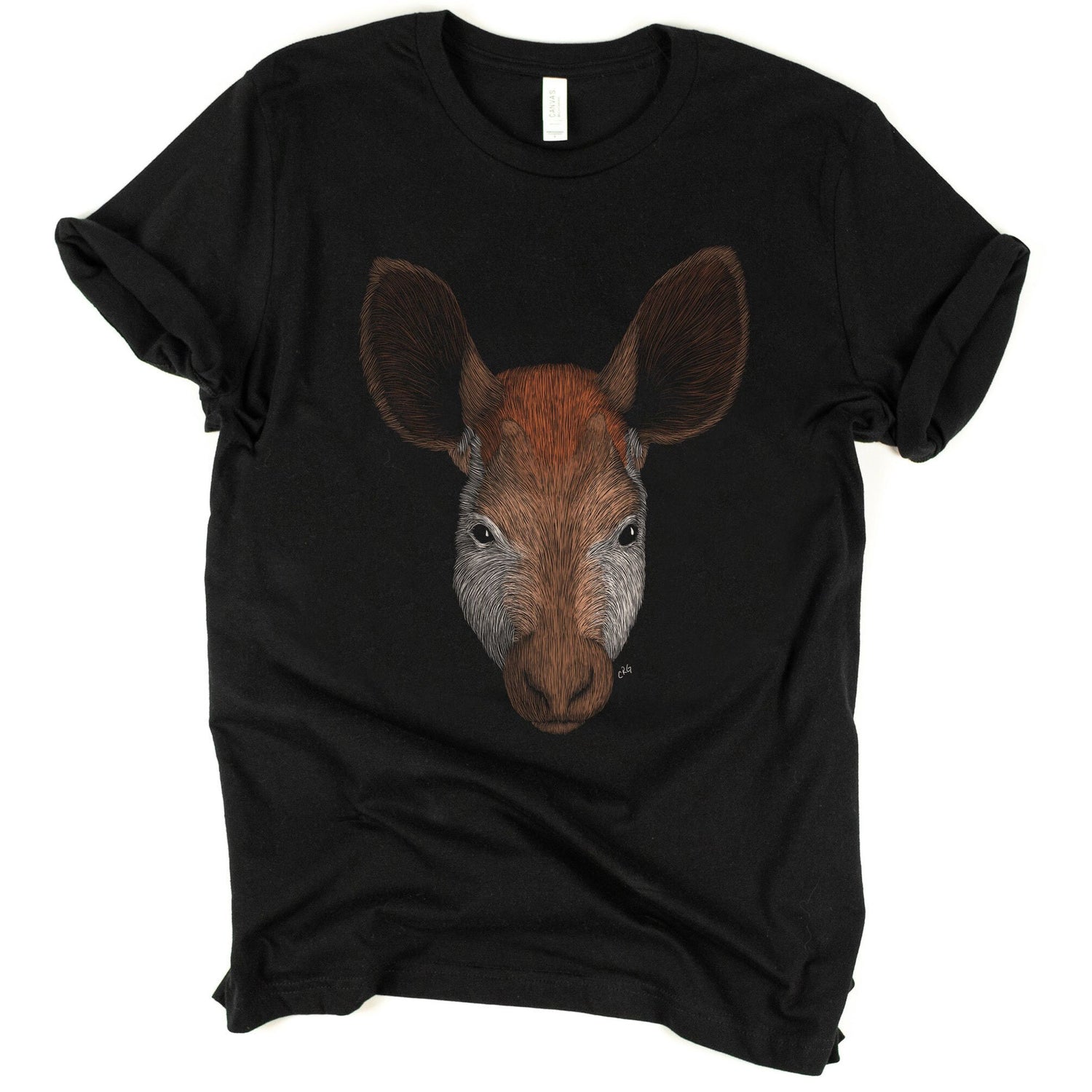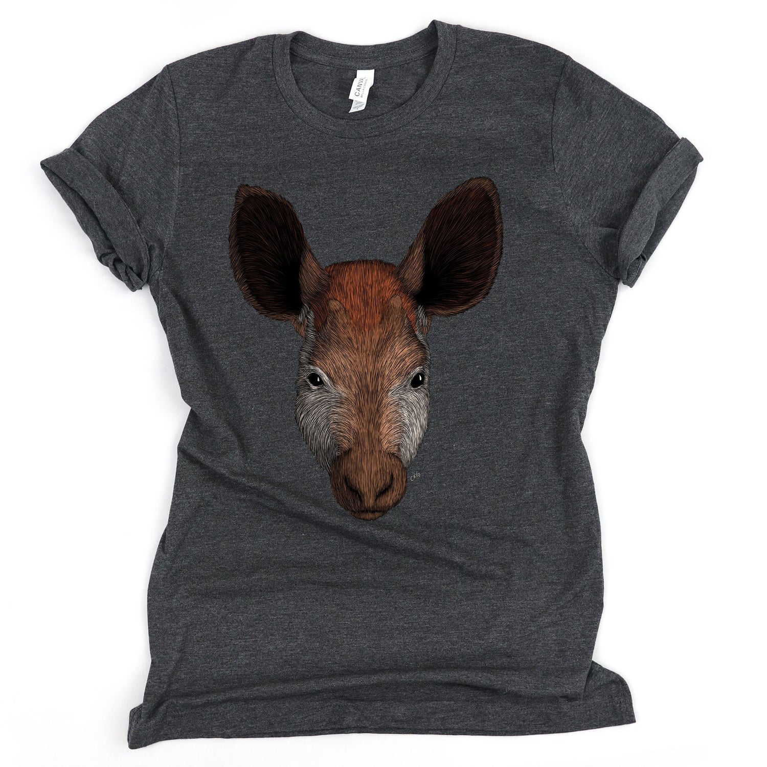 Did you know that an okapi tongue can be as long as 18 inches--long enough to be able to lick their eyes and ears? Luckily, this shirt has no tongue! Show your love for the closest living relative to the giraffe without the worry of it licking anything.