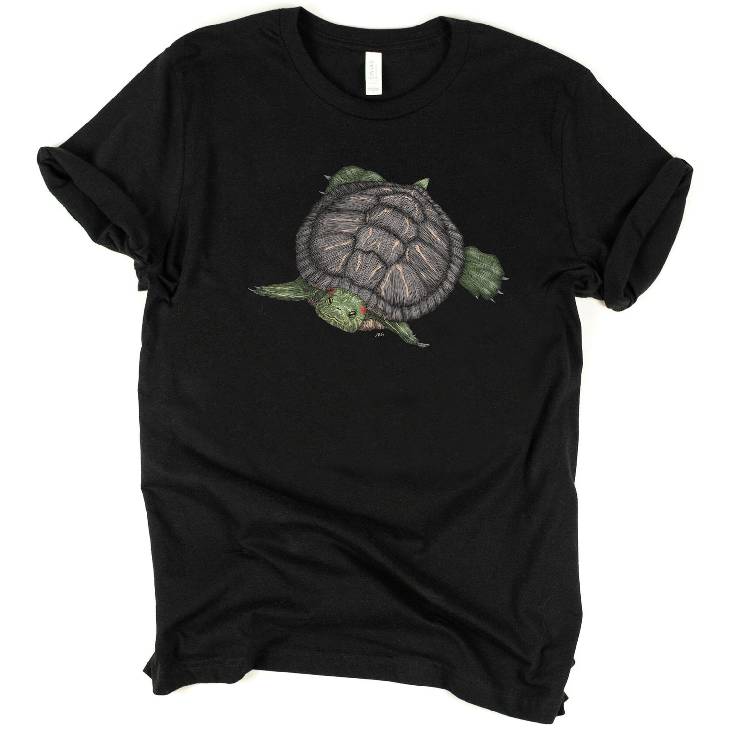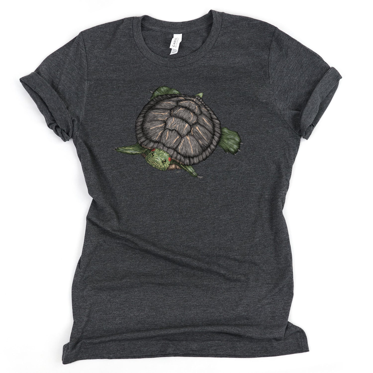 Did you know that the sex of a red-eared slider is determined by the temperature during development? If it's 82 degrees or cooler, all of the eggs will develop into males, but if it's 87 degrees or warmer, all of the eggs will be female. The temperatures in between will allow for eggs that develop into both sexes. Luckily, this shirt is unisex--so it is neither male or female. Show your love for these adorable turtles without the worry of losing it in the water.