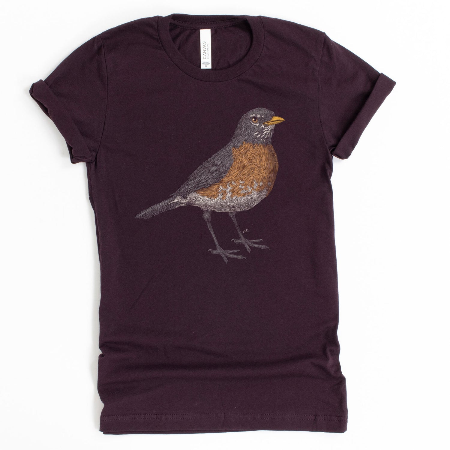 Did you know that American robins have better eyesight than humans, and possibly even a wider range of colors, allowing them to spot earthworms? Luckily, this shirt has no eyes, and therefore cannot see earthworms. Show your love for this beautiful singer without the worry of finding worms everywhere.