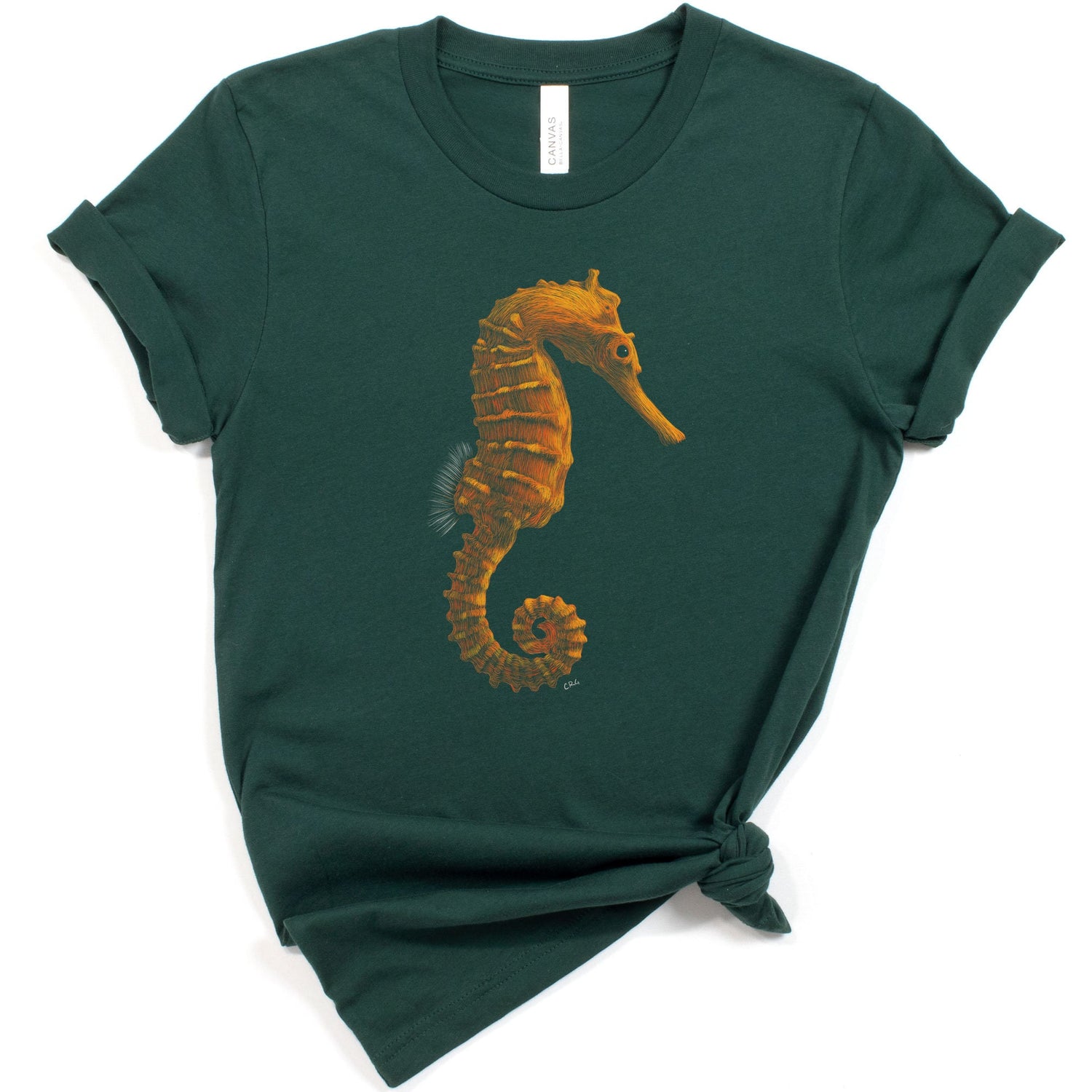 Did you know that seahorses will use their tail to grasp objects--whether it's other seahorses so they don't lose them, coral to take a rest, or floating vegetation to hitch a ride? This shirt doesn't have a tail, so it won't be grasping anything any time soon. Show your love for these tiny fish without the fear of a tail grabbing onto objects as you pass by.